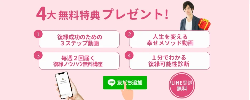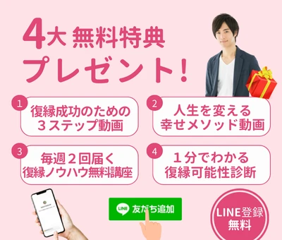 そのように、復縁していただくために、無料の情報を配信しています。「復縁したい!を叶える後悔しない復縁方法」どんな復縁のケースでも、どうしてもやったほうがいいこと、絶対にやってはいけないこと、があります。復縁で失敗する方の多くは、やったほうがいいことをしません。逆に、やってはいけないことを、無意識にやってしまいます。
